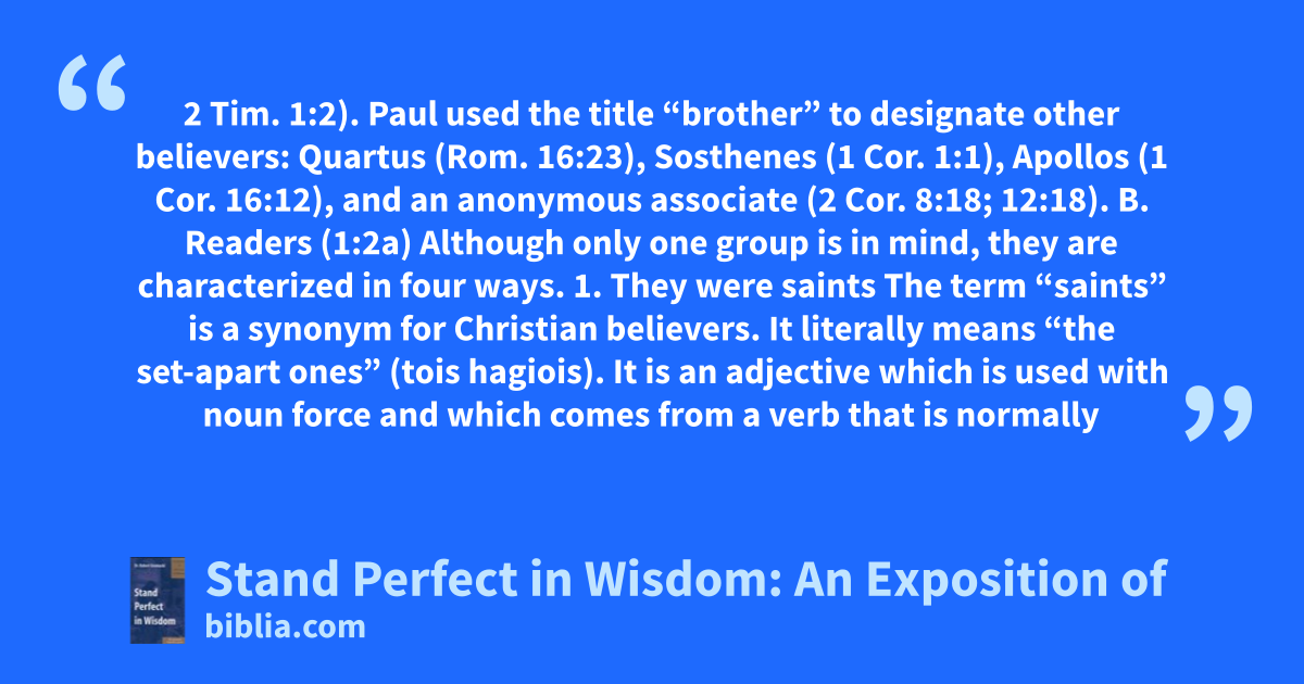 2 Tim. 1:2). Paul used the title “brother” to designate other believers: Quartus (Rom. 16:23), Sosthenes (1 Cor. 1:1), Apollos (1 Cor. 16:12), and an anonymous associate (2 Cor. 8:18; 12:18). B. Readers (1:2a) Although only one group is in mind, they are characterized in four ways. 1. They were saints The term “saints” is a synonym for Christian believers. It literally means “the set-apart ones” (tois hagiois). It is an adjective which is used with noun force and which comes from a verb that is normally