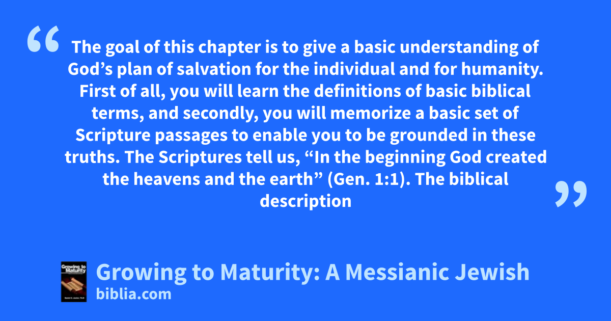 The goal of this chapter is to give a basic understanding of God’s plan of salvation for the individual and for humanity. First of all, you will learn the definitions of basic biblical terms, and secondly, you will memorize a basic set of Scripture passages to enable you to be grounded in these truths. The Scriptures tell us, “In the beginning God created the heavens and the earth” (Gen. 1:1). The biblical description