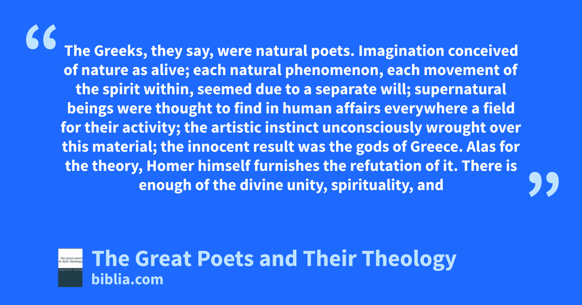 The Greeks, they say, were natural poets. Imagination conceived of nature as alive; each natural phenomenon, each movement of the spirit within, seemed due to a separate will; supernatural beings were thought to find in human affairs everywhere a field for their activity; the artistic instinct unconsciously wrought over this material; the innocent result was the gods of Greece. Alas for the theory, Homer himself furnishes the refutation of it. There is enough of the divine unity, spirituality, and