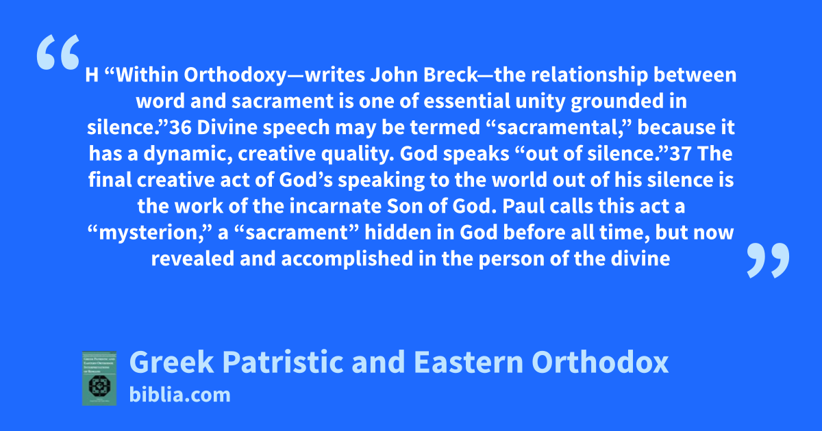 H “Within Orthodoxy—writes John Breck—the relationship between word and sacrament is one of essential unity grounded in silence.”36 Divine speech may be termed “sacramental,” because it has a dynamic, creative quality. God speaks “out of silence.”37 The final creative act of God’s speaking to the world out of his silence is the work of the incarnate Son of God. Paul calls this act a “mysterion,” a “sacrament” hidden in God before all time, but now revealed and accomplished in the person of the divine