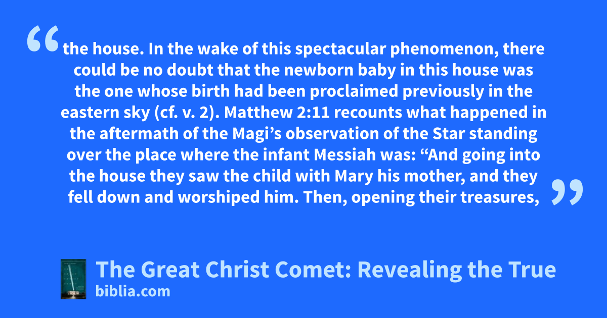 the house. In the wake of this spectacular phenomenon, there could be no doubt that the newborn baby in this house was the one whose birth had been proclaimed previously in the eastern sky (cf. v. 2). Matthew 2:11 recounts what happened in the aftermath of the Magi’s observation of the Star standing over the place where the infant Messiah was: “And going into the house they saw the child with Mary his mother, and they fell down and worshiped him. Then, opening their treasures,