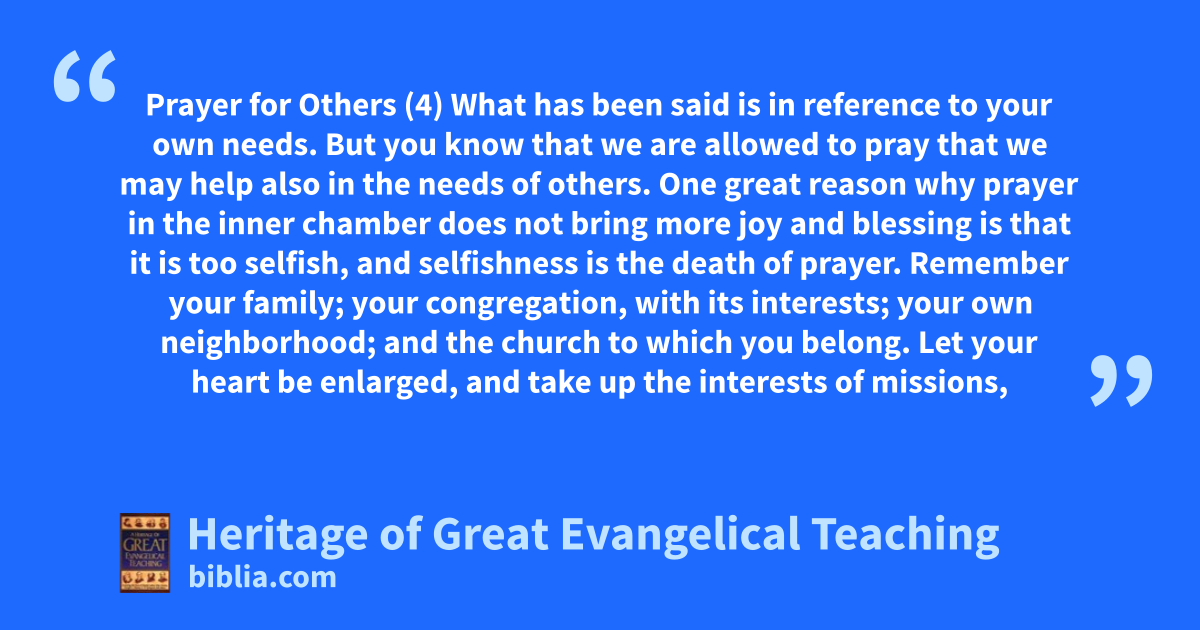 Prayer for Others (4) What has been said is in reference to your own needs. But you know that we are allowed to pray that we may help also in the needs of others. One great reason why prayer in the inner chamber does not bring more joy and blessing is that it is too selfish, and selfishness is the death of prayer. Remember your family; your congregation, with its interests; your own neighborhood; and the church to which you belong. Let your heart be enlarged, and take up the interests of missions,