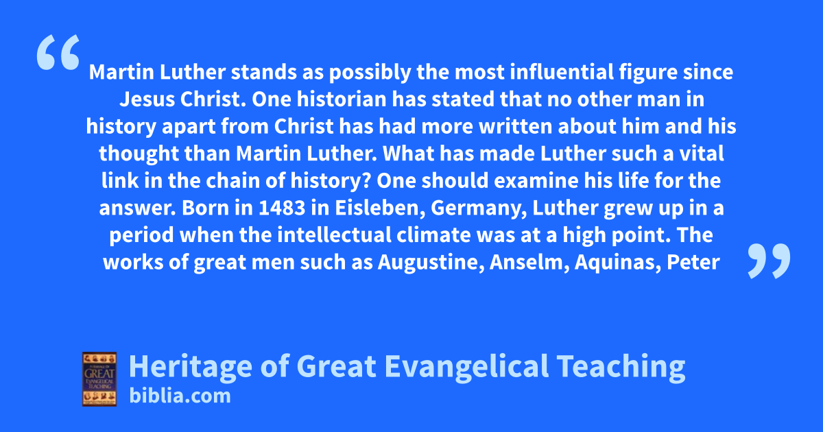 Martin Luther stands as possibly the most influential figure since Jesus Christ. One historian has stated that no other man in history apart from Christ has had more written about him and his thought than Martin Luther. What has made Luther such a vital link in the chain of history? One should examine his life for the answer. Born in 1483 in Eisleben, Germany, Luther grew up in a period when the intellectual climate was at a high point. The works of great men such as Augustine, Anselm, Aquinas, Peter