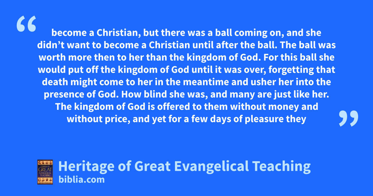 become a Christian, but there was a ball coming on, and she didn’t want to become a Christian until after the ball. The ball was worth more then to her than the kingdom of God. For this ball she would put off the kingdom of God until it was over, forgetting that death might come to her in the meantime and usher her into the presence of God. How blind she was, and many are just like her. The kingdom of God is offered to them without money and without price, and yet for a few days of pleasure they