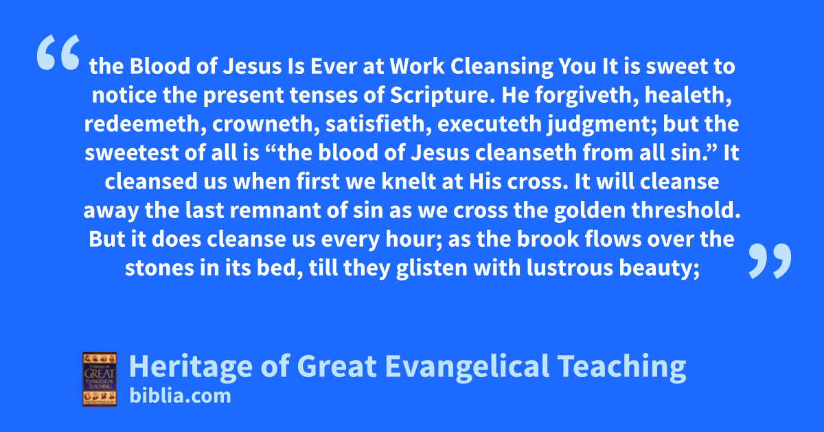 the Blood of Jesus Is Ever at Work Cleansing You It is sweet to notice the present tenses of Scripture. He forgiveth, healeth, redeemeth, crowneth, satisfieth, executeth judgment; but the sweetest of all is “the blood of Jesus cleanseth from all sin.” It cleansed us when first we knelt at His cross. It will cleanse away the last remnant of sin as we cross the golden threshold. But it does cleanse us every hour; as the brook flows over the stones in its bed, till they glisten with lustrous beauty;
