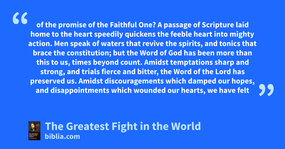 of the promise of the Faithful One? A passage of Scripture laid home to the heart speedily quickens the feeble heart into mighty action. Men speak of waters that revive the spirits, and tonics that brace the constitution; but the Word of God has been more than this to us, times beyond count. Amidst temptations sharp and strong, and trials fierce and bitter, the Word of the Lord has preserved us. Amidst discouragements which damped our hopes, and disappointments which wounded our hearts, we have felt