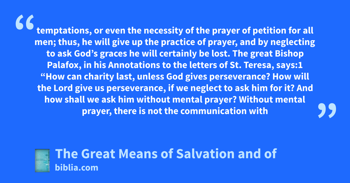 temptations, or even the necessity of the prayer of petition for all men; thus, he will give up the practice of prayer, and by neglecting to ask God’s graces he will certainly be lost. The great Bishop Palafox, in his Annotations to the letters of St. Teresa, says:1 “How can charity last, unless God gives perseverance? How will the Lord give us perseverance, if we neglect to ask him for it? And how shall we ask him without mental prayer? Without mental prayer, there is not the communication with