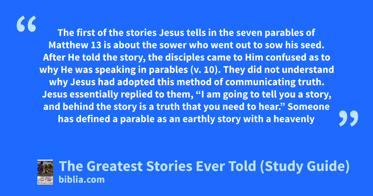 The first of the stories Jesus tells in the seven parables of Matthew 13 is about the sower who went out to sow his seed. After He told the story, the disciples came to Him confused as to why He was speaking in parables (v. 10). They did not understand why Jesus had adopted this method of communicating truth. Jesus essentially replied to them, “I am going to tell you a story, and behind the story is a truth that you need to hear.” Someone has defined a parable as an earthly story with a heavenly