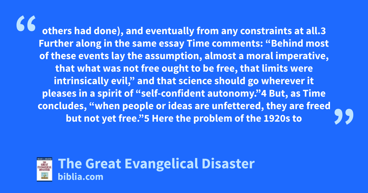 others had done), and eventually from any constraints at all.3 Further along in the same essay Time comments: “Behind most of these events lay the assumption, almost a moral imperative, that what was not free ought to be free, that limits were intrinsically evil,” and that science should go wherever it pleases in a spirit of “self-confident autonomy.”4 But, as Time concludes, “when people or ideas are unfettered, they are freed but not yet free.”5 Here the problem of the 1920s to