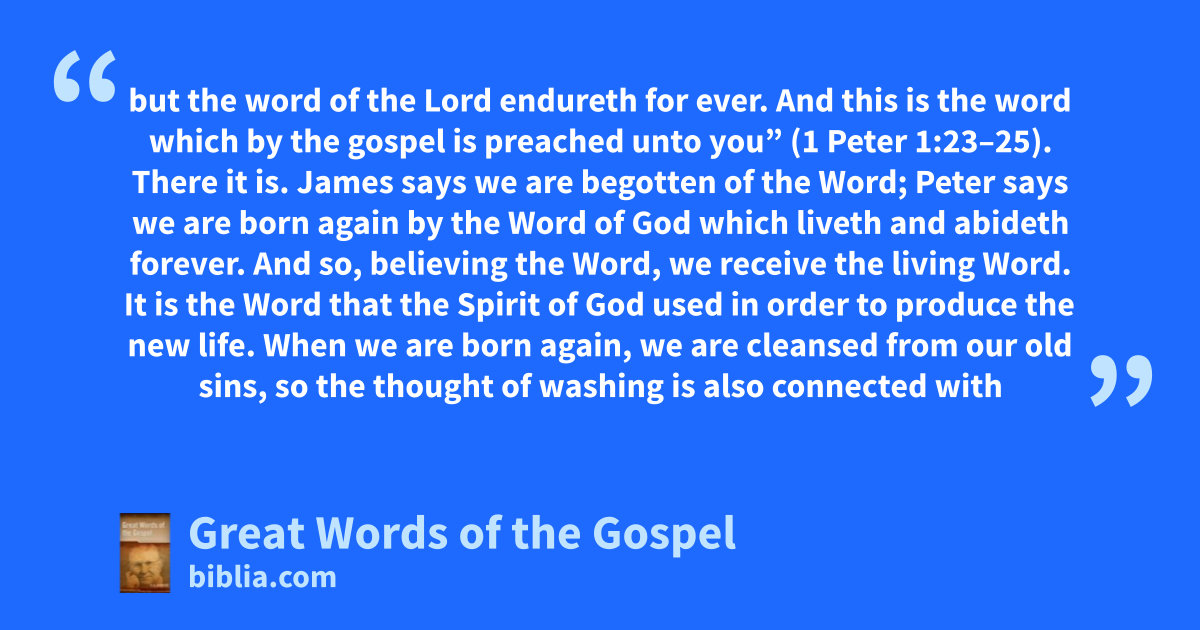 but the word of the Lord endureth for ever. And this is the word which by the gospel is preached unto you” (1 Peter 1:23–25). There it is. James says we are begotten of the Word; Peter says we are born again by the Word of God which liveth and abideth forever. And so, believing the Word, we receive the living Word. It is the Word that the Spirit of God used in order to produce the new life. When we are born again, we are cleansed from our old sins, so the thought of washing is also connected with