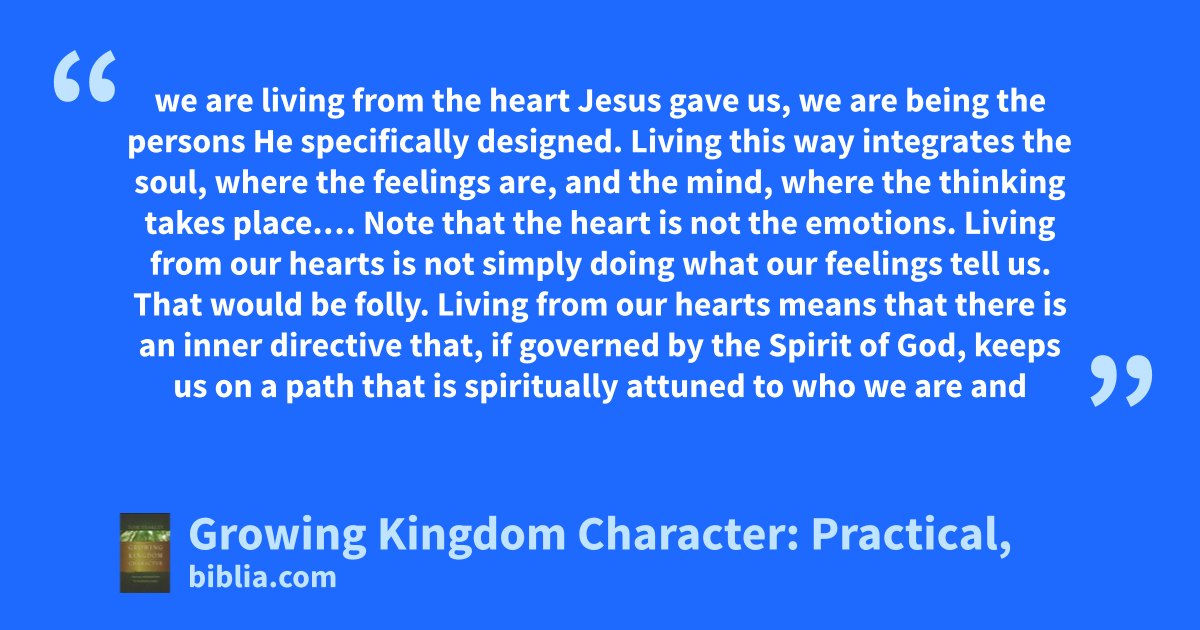 we are living from the heart Jesus gave us, we are being the persons He specifically designed. Living this way integrates the soul, where the feelings are, and the mind, where the thinking takes place.… Note that the heart is not the emotions. Living from our hearts is not simply doing what our feelings tell us. That would be folly. Living from our hearts means that there is an inner directive that, if governed by the Spirit of God, keeps us on a path that is spiritually attuned to who we are and