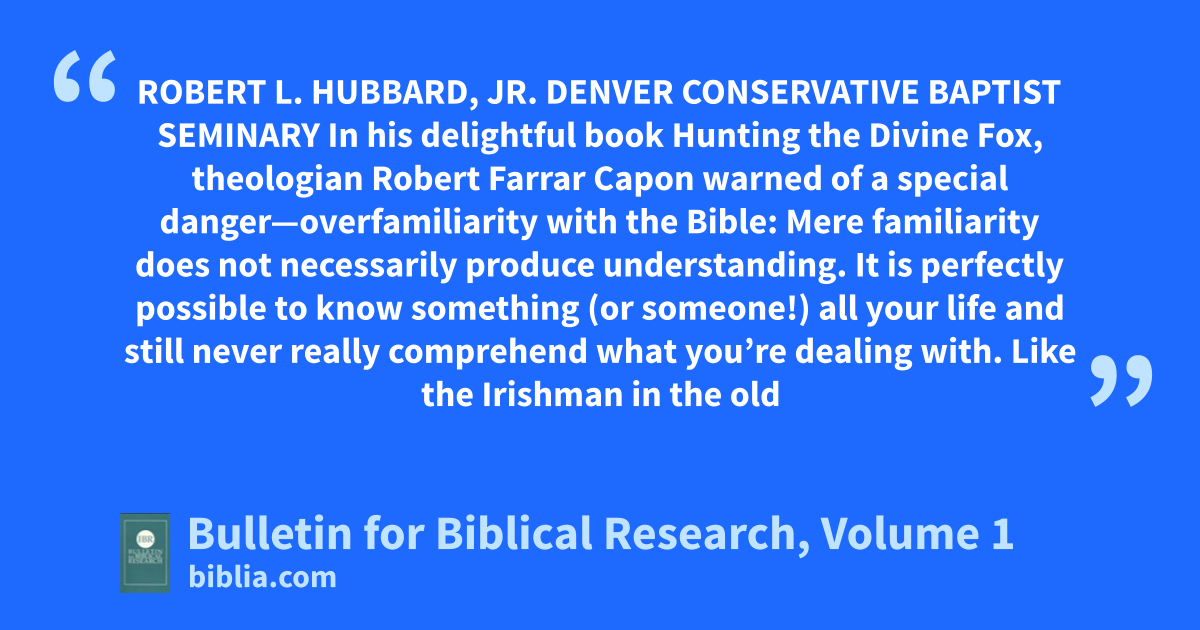 ROBERT L. HUBBARD, JR. DENVER CONSERVATIVE BAPTIST SEMINARY In his delightful book Hunting the Divine Fox, theologian Robert Farrar Capon warned of a special danger—overfamiliarity with the Bible: Mere familiarity does not necessarily produce understanding. It is perfectly possible to know something (or someone!) all your life and still never really comprehend what you’re dealing with. Like the Irishman in the old