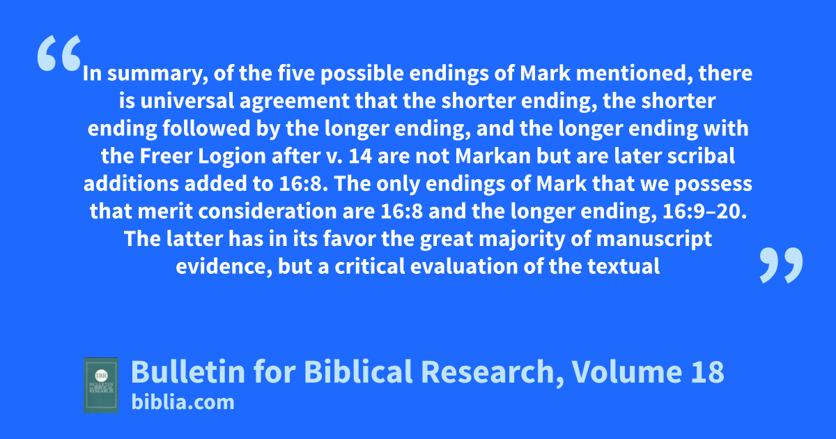 In summary, of the five possible endings of Mark mentioned, there is universal agreement that the shorter ending, the shorter ending followed by the longer ending, and the longer ending with the Freer Logion after v. 14 are not Markan but are later scribal additions added to 16:8. The only endings of Mark that we possess that merit consideration are 16:8 and the longer ending, 16:9–20. The latter has in its favor the great majority of manuscript evidence, but a critical evaluation of the textual