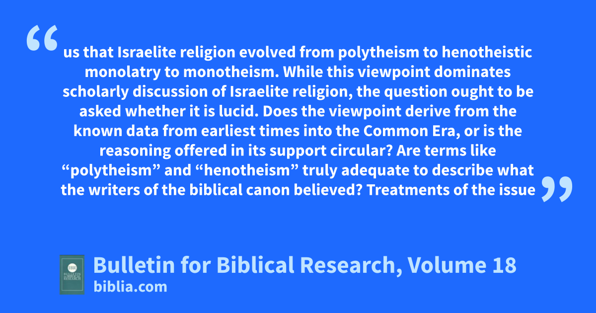 us that Israelite religion evolved from polytheism to henotheistic monolatry to monotheism. While this viewpoint dominates scholarly discussion of Israelite religion, the question ought to be asked whether it is lucid. Does the viewpoint derive from the known data from earliest times into the Common Era, or is the reasoning offered in its support circular? Are terms like “polytheism” and “henotheism” truly adequate to describe what the writers of the biblical canon believed? Treatments of the issue