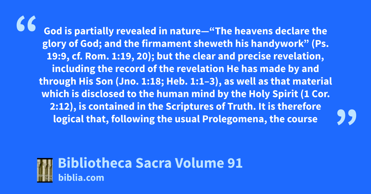 God is partially revealed in nature—“The heavens declare the glory of God; and the firmament sheweth his handywork” (Ps. 19:9, cf. Rom. 1:19, 20); but the clear and precise revelation, including the record of the revelation He has made by and through His Son (Jno. 1:18; Heb. 1:1–3), as well as that material which is disclosed to the human mind by the Holy Spirit (1 Cor. 2:12), is contained in the Scriptures of Truth. It is therefore logical that, following the usual Prolegomena, the course