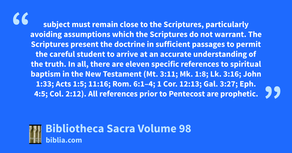 subject must remain close to the Scriptures, particularly avoiding assumptions which the Scriptures do not warrant. The Scriptures present the doctrine in sufficient passages to permit the careful student to arrive at an accurate understanding of the truth. In all, there are eleven specific references to spiritual baptism in the New Testament (Mt. 3:11; Mk. 1:8; Lk. 3:16; John 1:33; Acts 1:5; 11:16; Rom. 6:1–4; 1 Cor. 12:13; Gal. 3:27; Eph. 4:5; Col. 2:12). All references prior to Pentecost are prophetic.