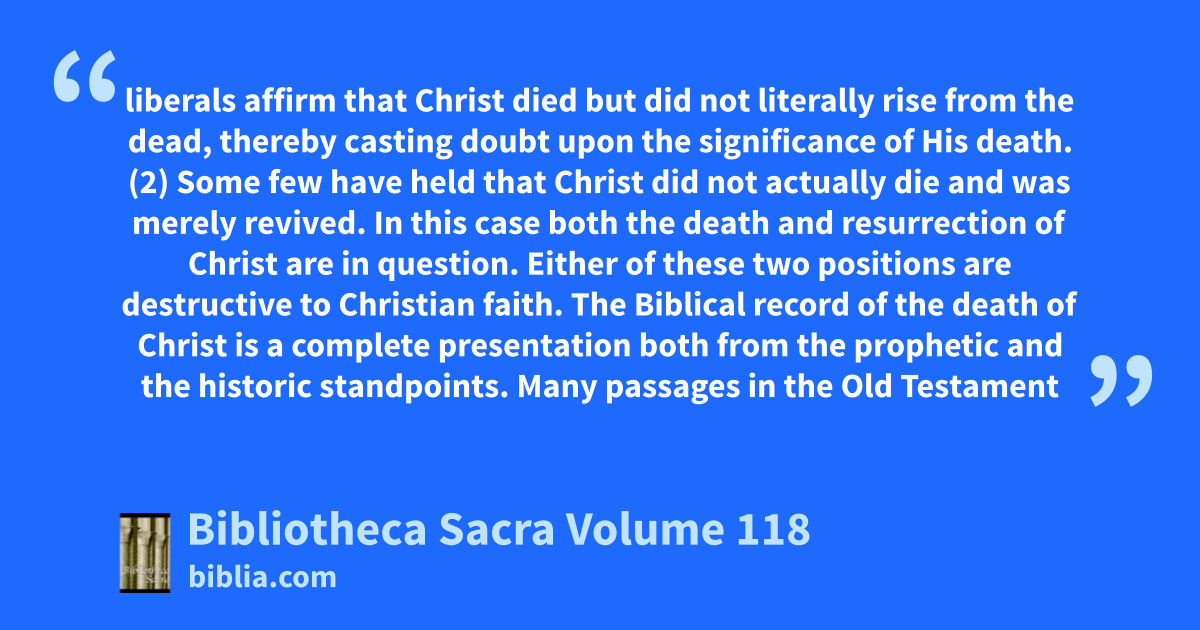 liberals affirm that Christ died but did not literally rise from the dead, thereby casting doubt upon the significance of His death. (2) Some few have held that Christ did not actually die and was merely revived. In this case both the death and resurrection of Christ are in question. Either of these two positions are destructive to Christian faith. The Biblical record of the death of Christ is a complete presentation both from the prophetic and the historic standpoints. Many passages in the Old Testament