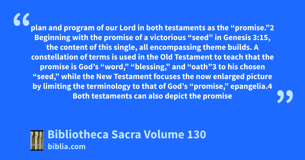 plan and program of our Lord in both testaments as the “promise.”2 Beginning with the promise of a victorious “seed” in Genesis 3:15, the content of this single, all encompassing theme builds. A constellation of terms is used in the Old Testament to teach that the promise is God’s “word,” “blessing,” and “oath”3 to his chosen “seed,” while the New Testament focuses the now enlarged picture by limiting the terminology to that of God’s “promise,” epangelia.4 Both testaments can also depict the promise
