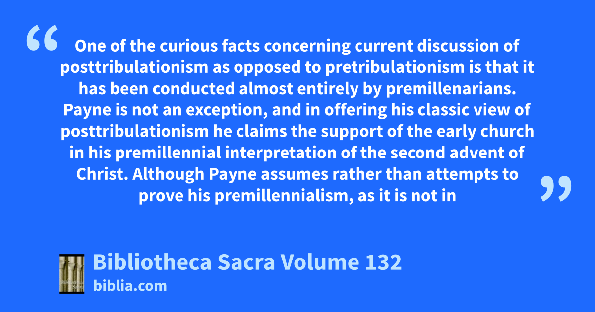 One of the curious facts concerning current discussion of posttribulationism as opposed to pretribulationism is that it has been conducted almost entirely by premillenarians. Payne is not an exception, and in offering his classic view of posttribulationism he claims the support of the early church in his premillennial interpretation of the second advent of Christ. Although Payne assumes rather than attempts to prove his premillennialism, as it is not in