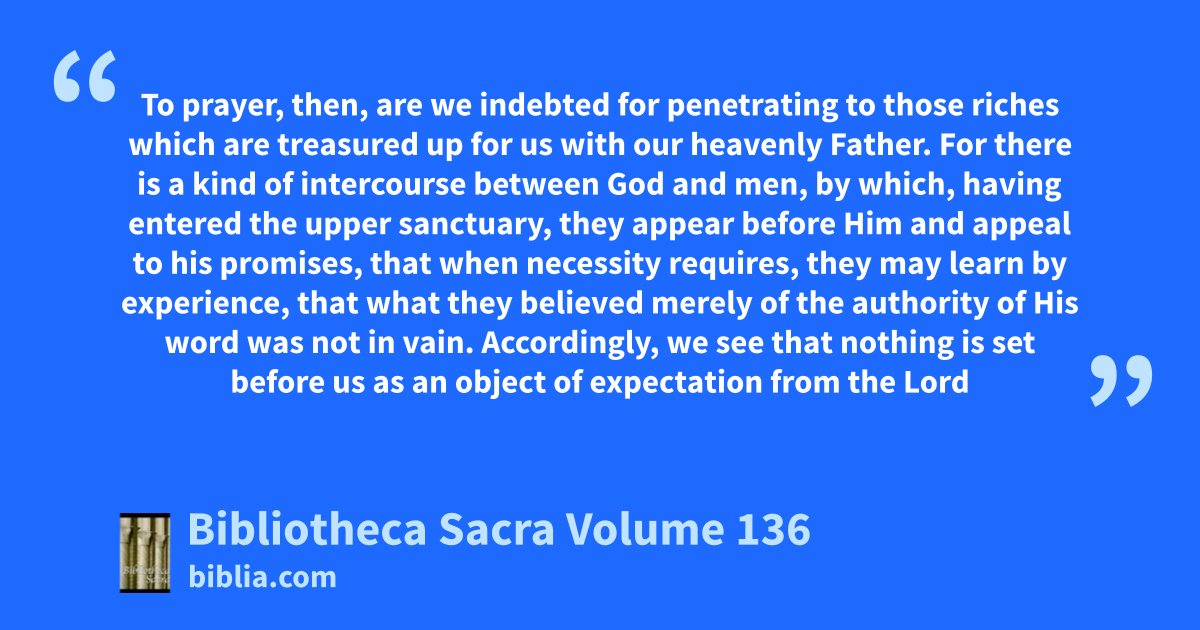 To prayer, then, are we indebted for penetrating to those riches which are treasured up for us with our heavenly Father. For there is a kind of intercourse between God and men, by which, having entered the upper sanctuary, they appear before Him and appeal to his promises, that when necessity requires, they may learn by experience, that what they believed merely of the authority of His word was not in vain. Accordingly, we see that nothing is set before us as an object of expectation from the Lord