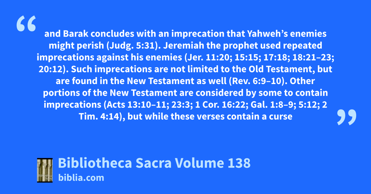 and Barak concludes with an imprecation that Yahweh’s enemies might perish (Judg. 5:31). Jeremiah the prophet used repeated imprecations against his enemies (Jer. 11:20; 15:15; 17:18; 18:21–23; 20:12). Such imprecations are not limited to the Old Testament, but are found in the New Testament as well (Rev. 6:9–10). Other portions of the New Testament are considered by some to contain imprecations (Acts 13:10–11; 23:3; 1 Cor. 16:22; Gal. 1:8–9; 5:12; 2 Tim. 4:14), but while these verses contain a curse