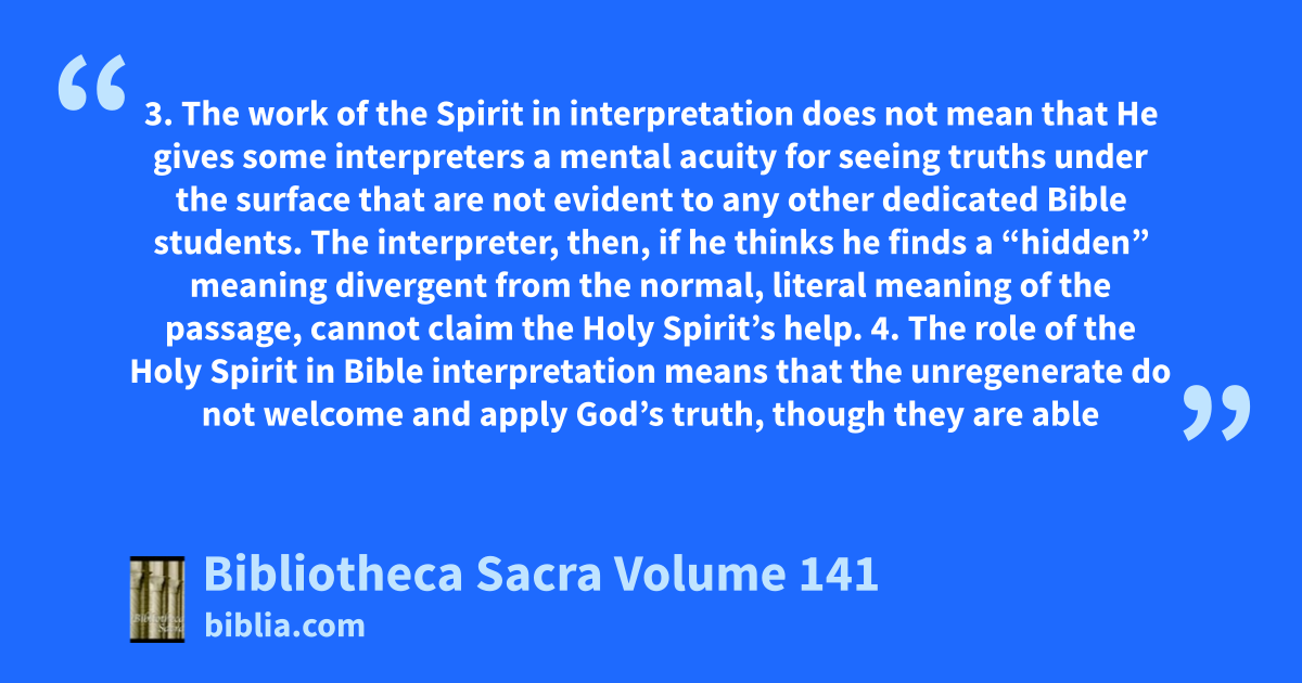 3. The work of the Spirit in interpretation does not mean that He gives some interpreters a mental acuity for seeing truths under the surface that are not evident to any other dedicated Bible students. The interpreter, then, if he thinks he finds a “hidden” meaning divergent from the normal, literal meaning of the passage, cannot claim the Holy Spirit’s help. 4. The role of the Holy Spirit in Bible interpretation means that the unregenerate do not welcome and apply God’s truth, though they are able