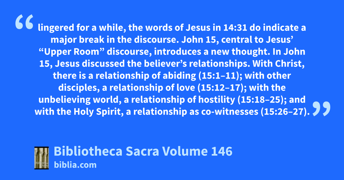 lingered for a while, the words of Jesus in 14:31 do indicate a major break in the discourse. John 15, central to Jesus’ “Upper Room” discourse, introduces a new thought. In John 15, Jesus discussed the believer’s relationships. With Christ, there is a relationship of abiding (15:1–11); with other disciples, a relationship of love (15:12–17); with the unbelieving world, a relationship of hostility (15:18–25); and with the Holy Spirit, a relationship as co-witnesses (15:26–27).