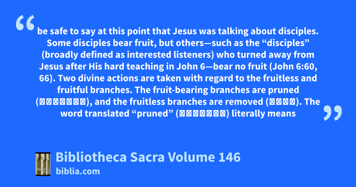 be safe to say at this point that Jesus was talking about disciples. Some disciples bear fruit, but others—such as the “disciples” (broadly defined as interested listeners) who turned away from Jesus after His hard teaching in John 6—bear no fruit (John 6:60, 66). Two divine actions are taken with regard to the fruitless and fruitful branches. The fruit-bearing branches are pruned (καθαίρω), and the fruitless branches are removed (αἴρω). The word translated “pruned” (καθαίρω) literally means