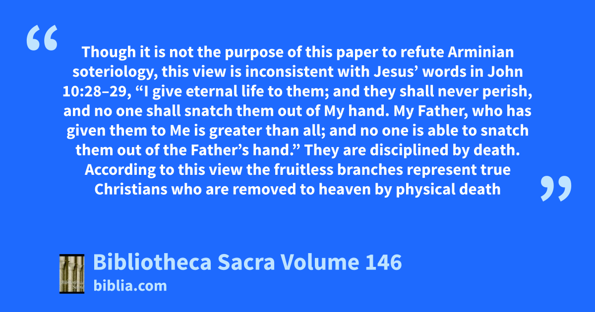 Though it is not the purpose of this paper to refute Arminian soteriology, this view is inconsistent with Jesus’ words in John 10:28–29, “I give eternal life to them; and they shall never perish, and no one shall snatch them out of My hand. My Father, who has given them to Me is greater than all; and no one is able to snatch them out of the Father’s hand.” They are disciplined by death. According to this view the fruitless branches represent true Christians who are removed to heaven by physical death