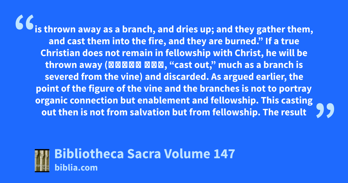 is thrown away as a branch, and dries up; and they gather them, and cast them into the fire, and they are burned.” If a true Christian does not remain in fellowship with Christ, he will be thrown away (βάλλω ἔξω, “cast out,” much as a branch is severed from the vine) and discarded. As argued earlier, the point of the figure of the vine and the branches is not to portray organic connection but enablement and fellowship. This casting out then is not from salvation but from fellowship. The result