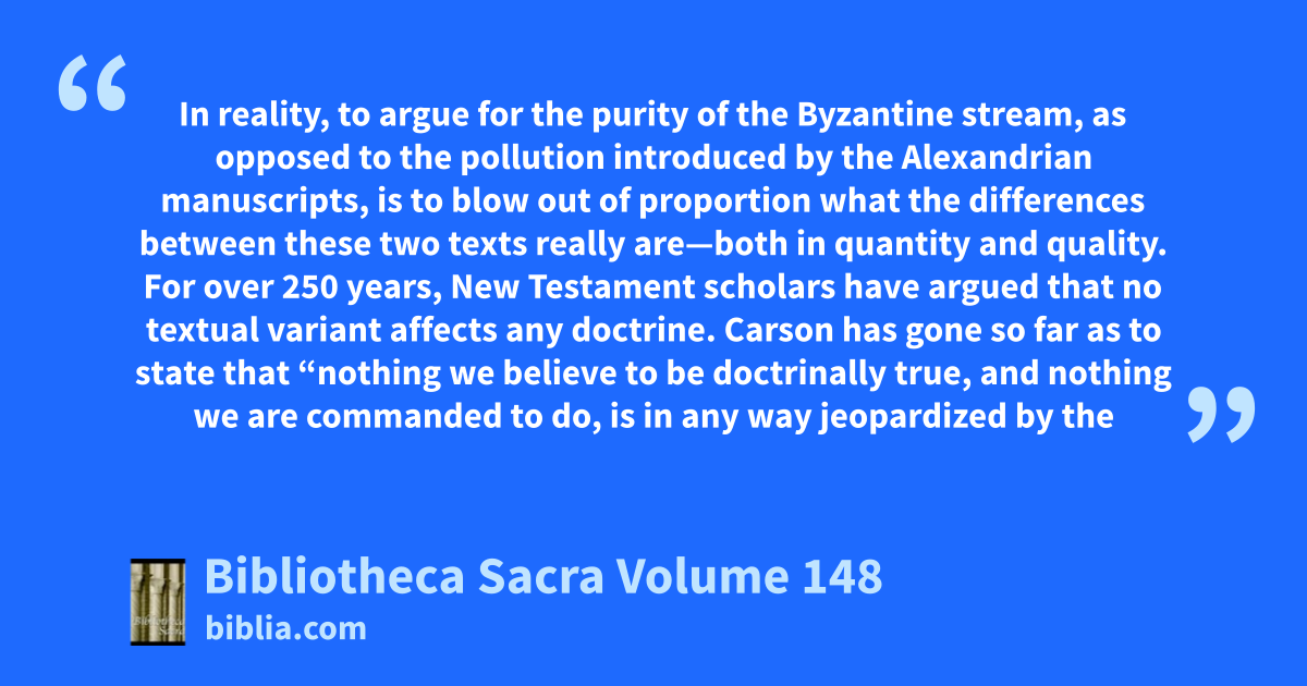 In reality, to argue for the purity of the Byzantine stream, as opposed to the pollution introduced by the Alexandrian manuscripts, is to blow out of proportion what the differences between these two texts really are—both in quantity and quality. For over 250 years, New Testament scholars have argued that no textual variant affects any doctrine. Carson has gone so far as to state that “nothing we believe to be doctrinally true, and nothing we are commanded to do, is in any way jeopardized by the