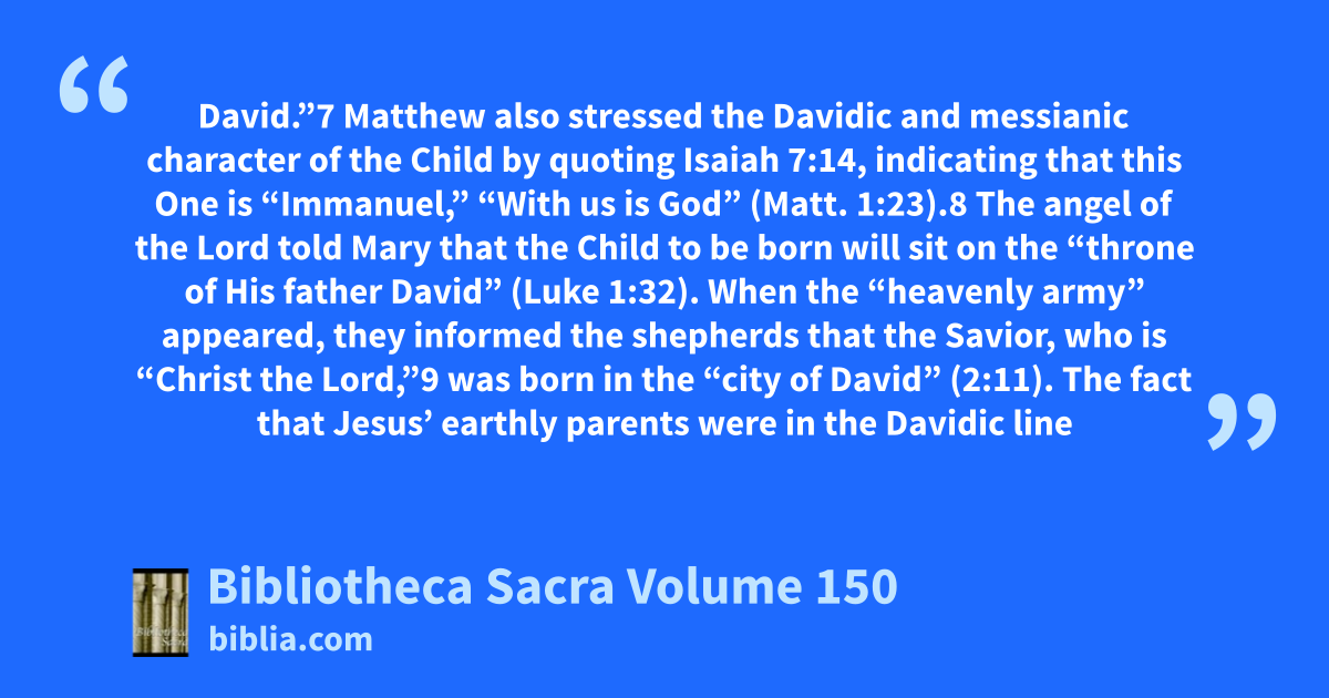 David.”7 Matthew also stressed the Davidic and messianic character of the Child by quoting Isaiah 7:14, indicating that this One is “Immanuel,” “With us is God” (Matt. 1:23).8 The angel of the Lord told Mary that the Child to be born will sit on the “throne of His father David” (Luke 1:32). When the “heavenly army” appeared, they informed the shepherds that the Savior, who is “Christ the Lord,”9 was born in the “city of David” (2:11). The fact that Jesus’ earthly parents were in the Davidic line