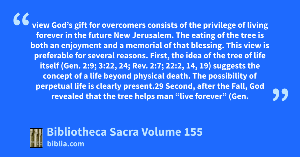 view God’s gift for overcomers consists of the privilege of living forever in the future New Jerusalem. The eating of the tree is both an enjoyment and a memorial of that blessing. This view is preferable for several reasons. First, the idea of the tree of life itself (Gen. 2:9; 3:22, 24; Rev. 2:7; 22:2, 14, 19) suggests the concept of a life beyond physical death. The possibility of perpetual life is clearly present.29 Second, after the Fall, God revealed that the tree helps man “live forever” (Gen.