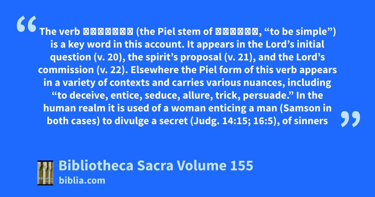 The verb פִּתָּה (the Piel stem of פָּתָה, “to be simple”) is a key word in this account. It appears in the Lord’s initial question (v. 20), the spirit’s proposal (v. 21), and the Lord’s commission (v. 22). Elsewhere the Piel form of this verb appears in a variety of contexts and carries various nuances, including “to deceive, entice, seduce, allure, trick, persuade.” In the human realm it is used of a woman enticing a man (Samson in both cases) to divulge a secret (Judg. 14:15; 16:5), of sinners
