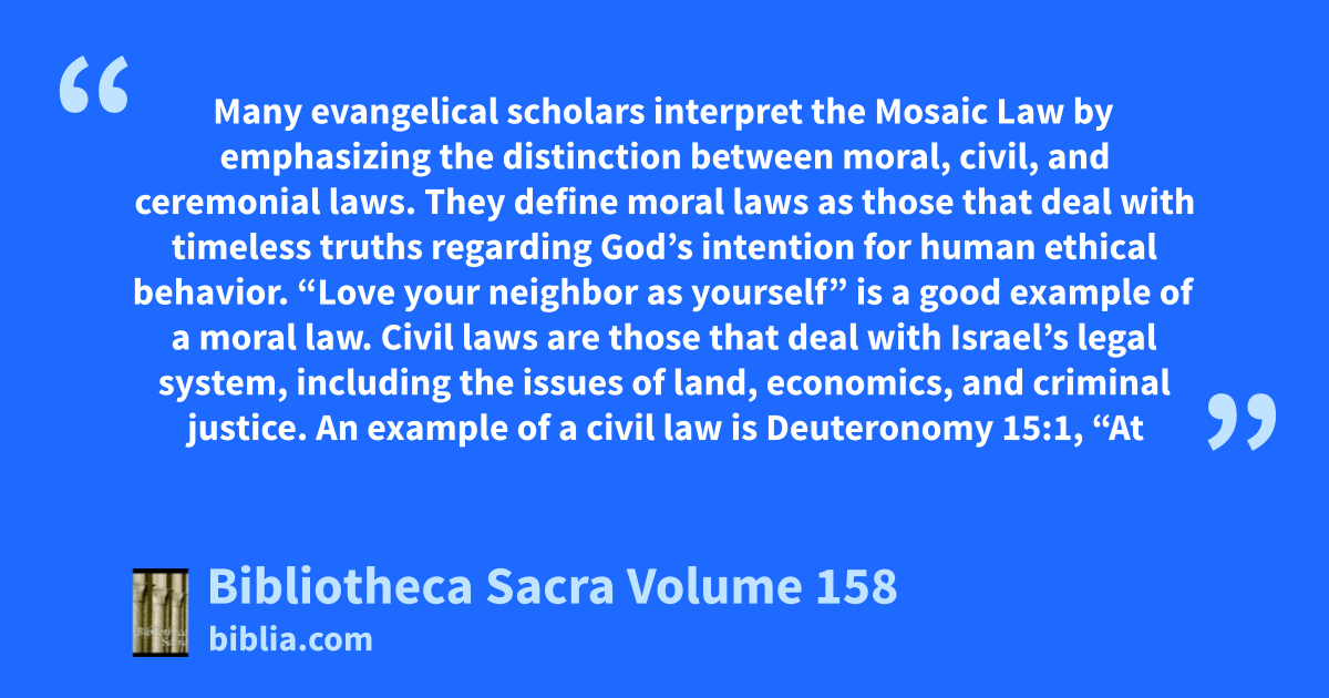 Many evangelical scholars interpret the Mosaic Law by emphasizing the distinction between moral, civil, and ceremonial laws. They define moral laws as those that deal with timeless truths regarding God’s intention for human ethical behavior. “Love your neighbor as yourself” is a good example of a moral law. Civil laws are those that deal with Israel’s legal system, including the issues of land, economics, and criminal justice. An example of a civil law is Deuteronomy 15:1, “At