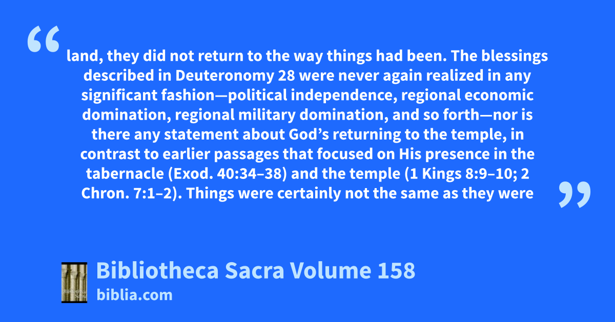 land, they did not return to the way things had been. The blessings described in Deuteronomy 28 were never again realized in any significant fashion—political independence, regional economic domination, regional military domination, and so forth—nor is there any statement about God’s returning to the temple, in contrast to earlier passages that focused on His presence in the tabernacle (Exod. 40:34–38) and the temple (1 Kings 8:9–10; 2 Chron. 7:1–2). Things were certainly not the same as they were