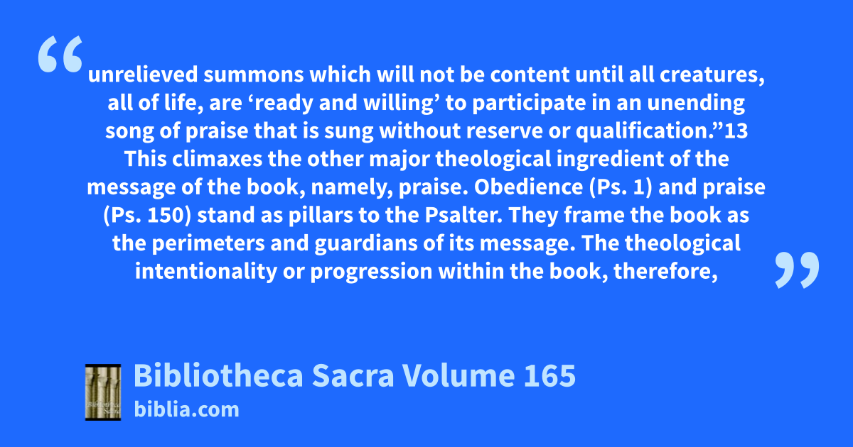 unrelieved summons which will not be content until all creatures, all of life, are ‘ready and willing’ to participate in an unending song of praise that is sung without reserve or qualification.”13 This climaxes the other major theological ingredient of the message of the book, namely, praise. Obedience (Ps. 1) and praise (Ps. 150) stand as pillars to the Psalter. They frame the book as the perimeters and guardians of its message. The theological intentionality or progression within the book, therefore,