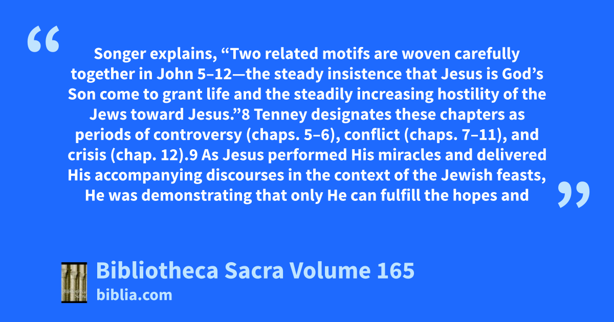 Songer explains, “Two related motifs are woven carefully together in John 5–12—the steady insistence that Jesus is God’s Son come to grant life and the steadily increasing hostility of the Jews toward Jesus.”8 Tenney designates these chapters as periods of controversy (chaps. 5–6), conflict (chaps. 7–11), and crisis (chap. 12).9 As Jesus performed His miracles and delivered His accompanying discourses in the context of the Jewish feasts, He was demonstrating that only He can fulfill the hopes and