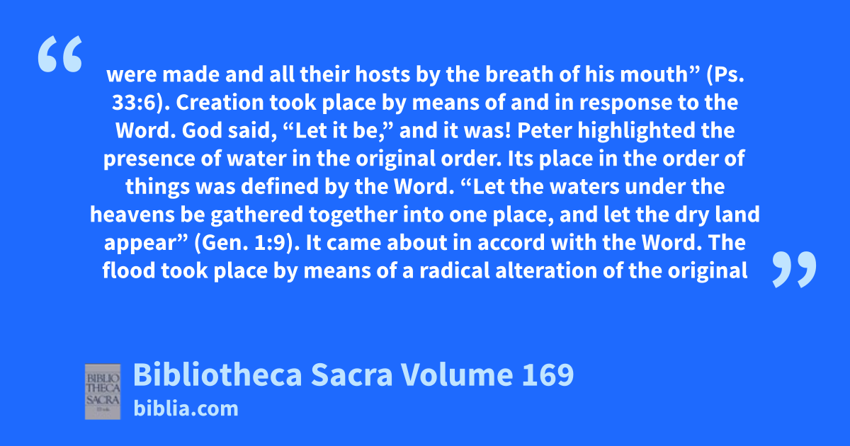were made and all their hosts by the breath of his mouth” (Ps. 33:6). Creation took place by means of and in response to the Word. God said, “Let it be,” and it was! Peter highlighted the presence of water in the original order. Its place in the order of things was defined by the Word. “Let the waters under the heavens be gathered together into one place, and let the dry land appear” (Gen. 1:9). It came about in accord with the Word. The flood took place by means of a radical alteration of the original