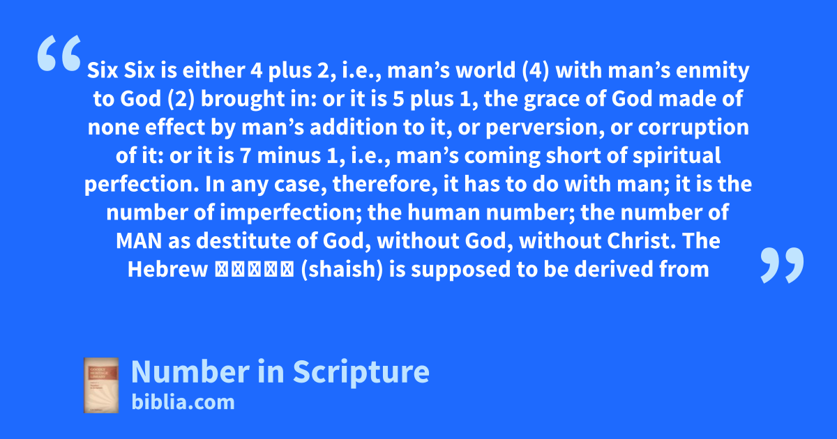 Six Six is either 4 plus 2, i.e., man’s world (4) with man’s enmity to God (2) brought in: or it is 5 plus 1, the grace of God made of none effect by man’s addition to it, or perversion, or corruption of it: or it is 7 minus 1, i.e., man’s coming short of spiritual perfection. In any case, therefore, it has to do with man; it is the number of imperfection; the human number; the number of MAN as destitute of God, without God, without Christ. The Hebrew שֵׁשׁ (shaish) is supposed to be derived from