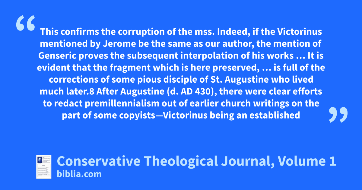 This confirms the corruption of the mss. Indeed, if the Victorinus mentioned by Jerome be the same as our author, the mention of Genseric proves the subsequent interpolation of his works … It is evident that the fragment which is here preserved, … is full of the corrections of some pious disciple of St. Augustine who lived much later.8 After Augustine (d. AD 430), there were clear efforts to redact premillennialism out of earlier church writings on the part of some copyists—Victorinus being an established