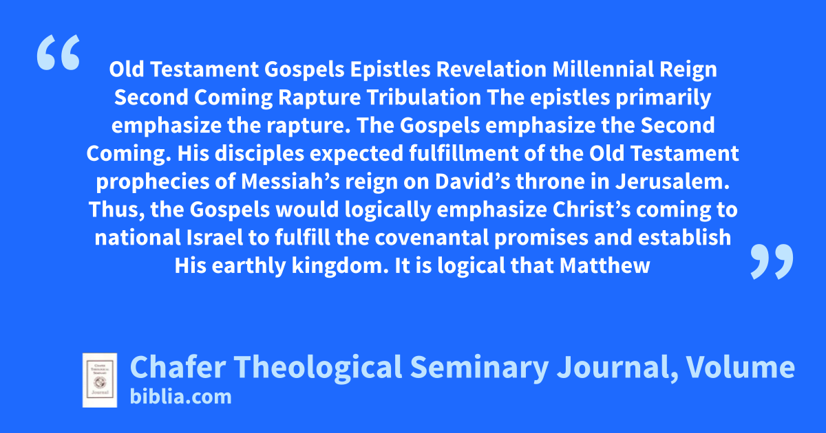 Old Testament Gospels Epistles Revelation Millennial Reign Second Coming Rapture Tribulation The epistles primarily emphasize the rapture. The Gospels emphasize the Second Coming. His disciples expected fulfillment of the Old Testament prophecies of Messiah’s reign on David’s throne in Jerusalem. Thus, the Gospels would logically emphasize Christ’s coming to national Israel to fulfill the covenantal promises and establish His earthly kingdom. It is logical that Matthew