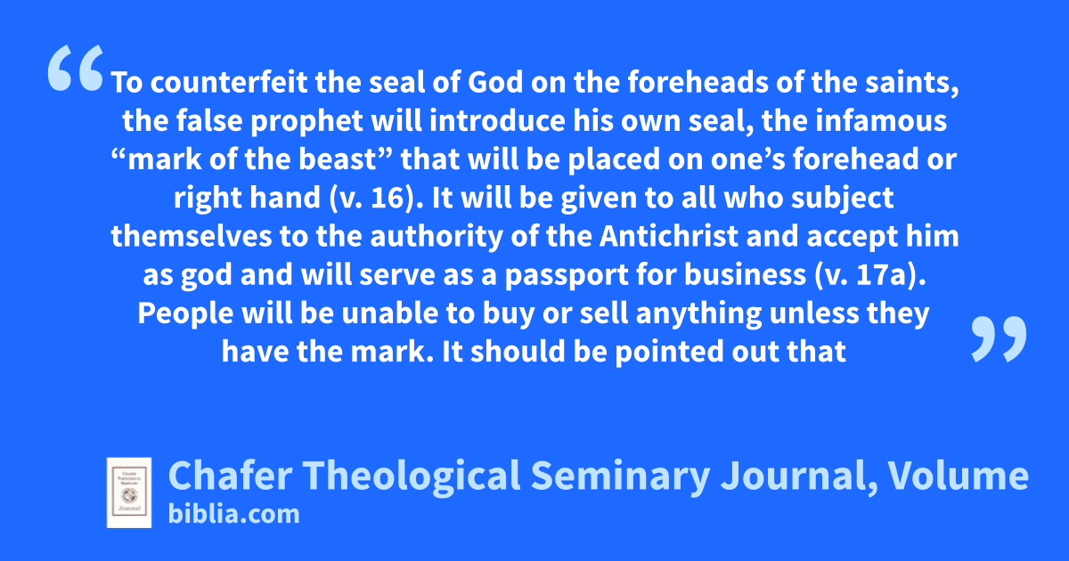 To counterfeit the seal of God on the foreheads of the saints, the false prophet will introduce his own seal, the infamous “mark of the beast” that will be placed on one’s forehead or right hand (v. 16). It will be given to all who subject themselves to the authority of the Antichrist and accept him as god and will serve as a passport for business (v. 17a). People will be unable to buy or sell anything unless they have the mark. It should be pointed out that