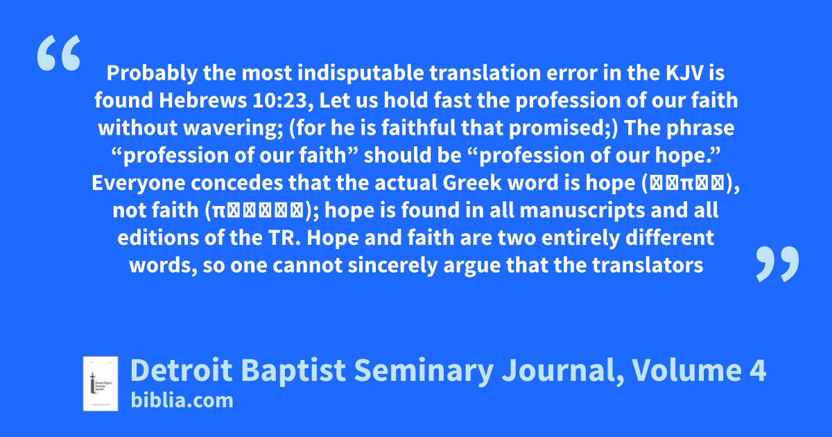 Probably the most indisputable translation error in the KJV is found Hebrews 10:23, Let us hold fast the profession of our faith without wavering; (for he is faithful that promised;) The phrase “profession of our faith” should be “profession of our hope.” Everyone concedes that the actual Greek word is hope (ἐλπίς), not faith (πίστις); hope is found in all manuscripts and all editions of the TR. Hope and faith are two entirely different words, so one cannot sincerely argue that the translators