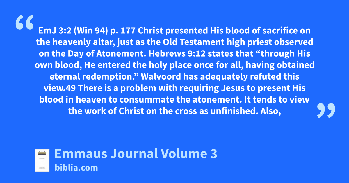 EmJ 3:2 (Win 94) p. 177 Christ presented His blood of sacrifice on the heavenly altar, just as the Old Testament high priest observed on the Day of Atonement. Hebrews 9:12 states that “through His own blood, He entered the holy place once for all, having obtained eternal redemption.” Walvoord has adequately refuted this view.49 There is a problem with requiring Jesus to present His blood in heaven to consummate the atonement. It tends to view the work of Christ on the cross as unfinished. Also,