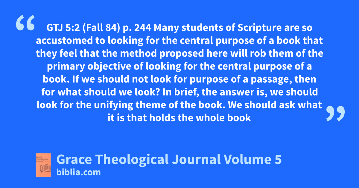 GTJ 5:2 (Fall 84) p. 244 Many students of Scripture are so accustomed to looking for the central purpose of a book that they feel that the method proposed here will rob them of the primary objective of looking for the central purpose of a book. If we should not look for purpose of a passage, then for what should we look? In brief, the answer is, we should look for the unifying theme of the book. We should ask what it is that holds the whole book