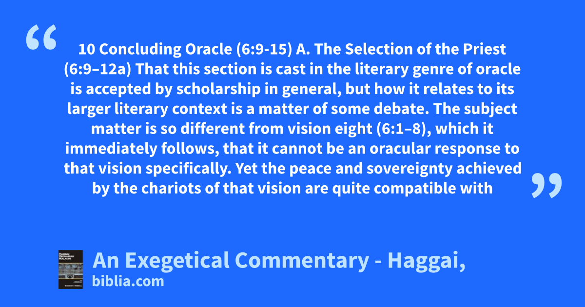 10 Concluding Oracle (6:9-15) A. The Selection of the Priest (6:9–12a) That this section is cast in the literary genre of oracle is accepted by scholarship in general, but how it relates to its larger literary context is a matter of some debate. The subject matter is so different from vision eight (6:1–8), which it immediately follows, that it cannot be an oracular response to that vision specifically. Yet the peace and sovereignty achieved by the chariots of that vision are quite compatible with