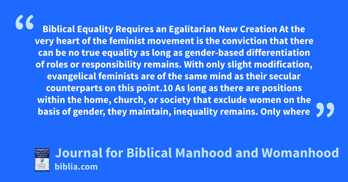 Biblical Equality Requires an Egalitarian New Creation At the very heart of the feminist movement is the conviction that there can be no true equality as long as gender-based differentiation of roles or responsibility remains. With only slight modification, evangelical feminists are of the same mind as their secular counterparts on this point.10 As long as there are positions within the home, church, or society that exclude women on the basis of gender, they maintain, inequality remains. Only where