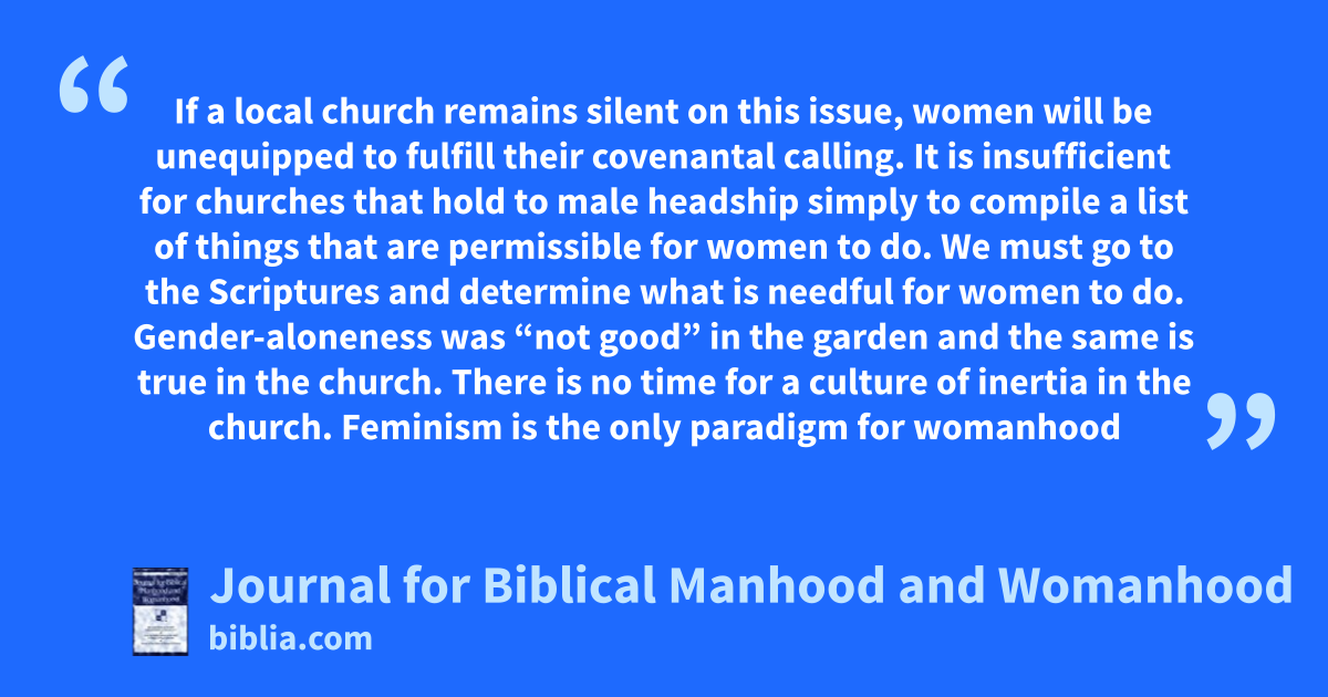 If a local church remains silent on this issue, women will be unequipped to fulfill their covenantal calling. It is insufficient for churches that hold to male headship simply to compile a list of things that are permissible for women to do. We must go to the Scriptures and determine what is needful for women to do. Gender-aloneness was “not good” in the garden and the same is true in the church. There is no time for a culture of inertia in the church. Feminism is the only paradigm for womanhood