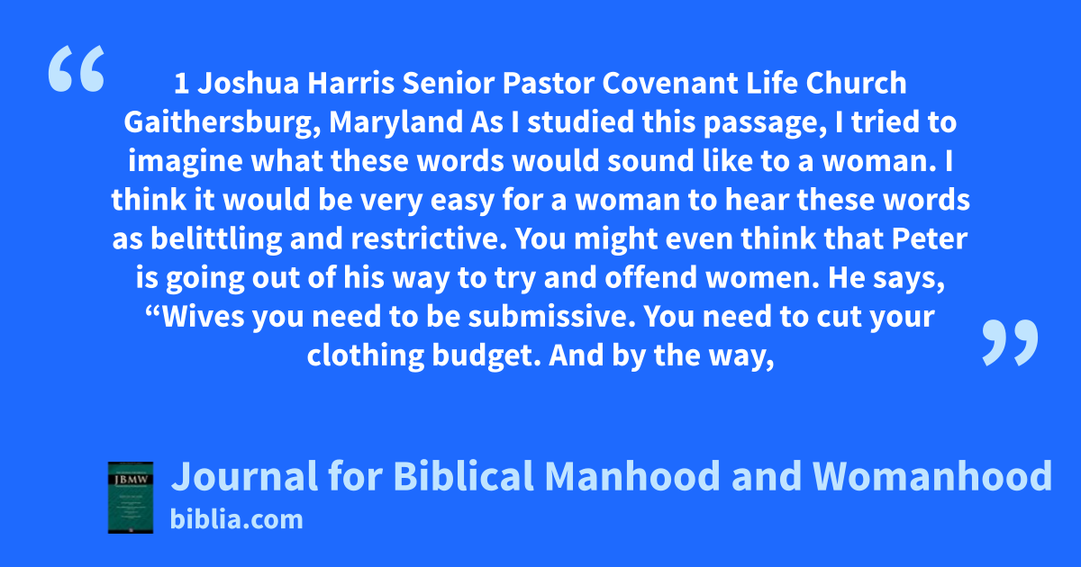 1 Joshua Harris Senior Pastor Covenant Life Church Gaithersburg, Maryland As I studied this passage, I tried to imagine what these words would sound like to a woman. I think it would be very easy for a woman to hear these words as belittling and restrictive. You might even think that Peter is going out of his way to try and offend women. He says, “Wives you need to be submissive. You need to cut your clothing budget. And by the way,
